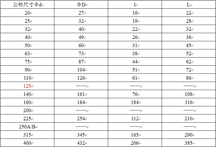 其中“ΦD”表示管件公称外径,“Φd”表示管件公称内径,“L”管件长度,“l”表示管件承插口长度,,1.0MPa=10公斤