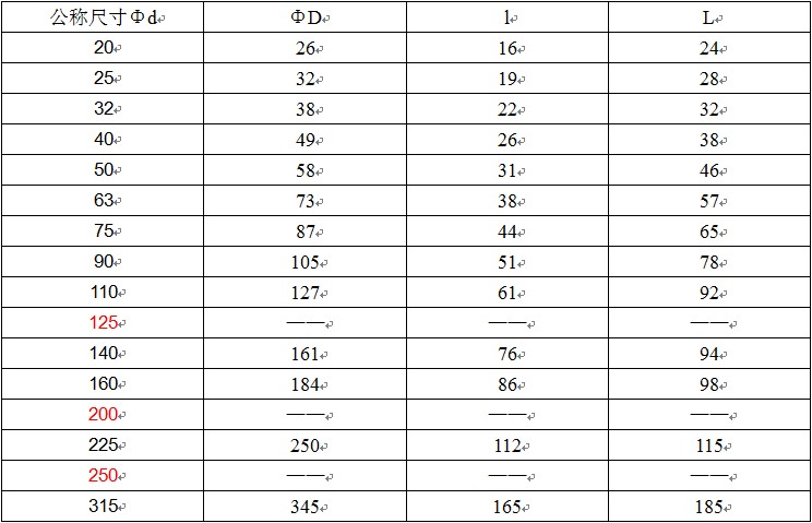 其中“ΦD”表示管件公称外径,“Φd”表示管件公称内径,“L”管件长度,“l”表示管件承插口长度,1.0MPa=10公斤
